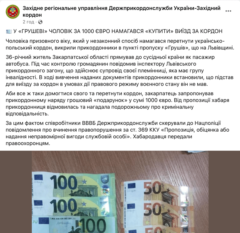 "Чтобы все-таки добиться своего и пересечь границу, закарпатец предложил пограничному наряду денежный "подарок" в сумме 1000 евро. От предложения взятки пограничник отказалась и напомнила мужчине об уголовной ответственности", — указали в ГПСУ.