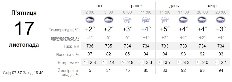 "Во Львове будет облачно. Ожидается дождь с мокрым снегом, утром и днем местами осадки. Ночью и утром слабый туман, на отдельных участках дорог гололедица. Ветер юго-восточный, 5-10 м/с. Температура ночью от -1 °С мороза до +4 °С тепла, днем +2...+7 °С", — говорится в сообщении.