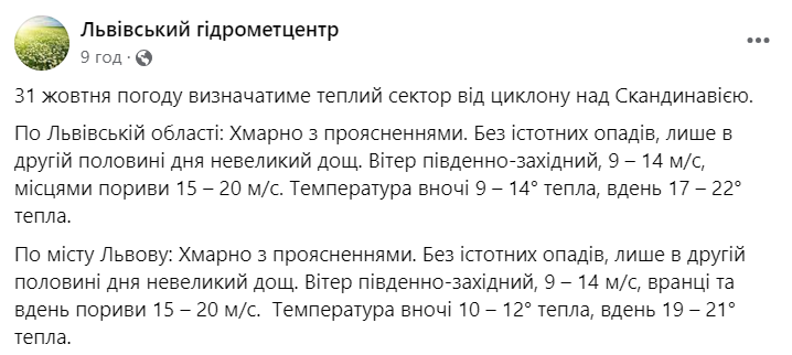 Скрин сообщения из Facebook львовского гидрометцентра