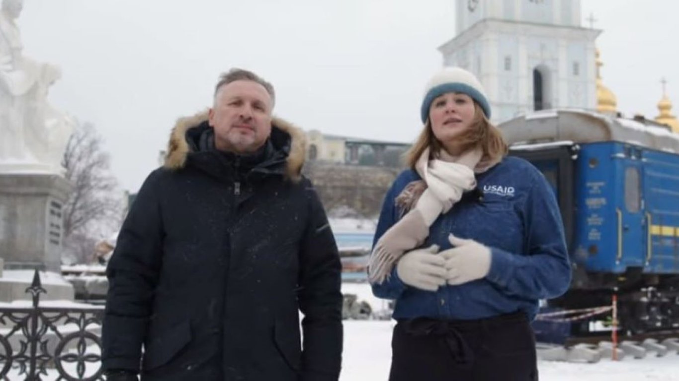 Представитель USAID Тесс Нихофф и представитель "Укрзалізниці" Олег Яковенко. Фото: скриншот видео