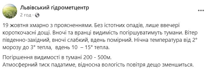 Сегодня, 19 октября, с утра небо во Львове покроется облаками, которые продержатся до конца дня. В Укргидрометеоцентре предупредили о сильном тумане в городе. Температура воздуха поднимется до +12 °C тепла. Существенных осадков не ожидается.