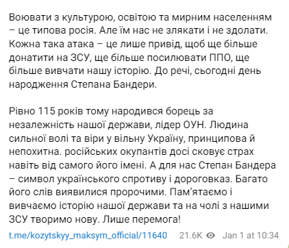 "Человек сильной воли и веры в свободную Украину, принципиальный и непоколебимый. Российских оккупантов до сих пор сковывает страх даже от самого его имени. А для нас Степан Бандера — символ украинского сопротивления и указателя. Многие его слова оказались пророческими. Помним и изучаем историю нашего государства и во главе с нашими ВСУ творим новую. Только победа!" — подытожил глава Львовской ОВА.