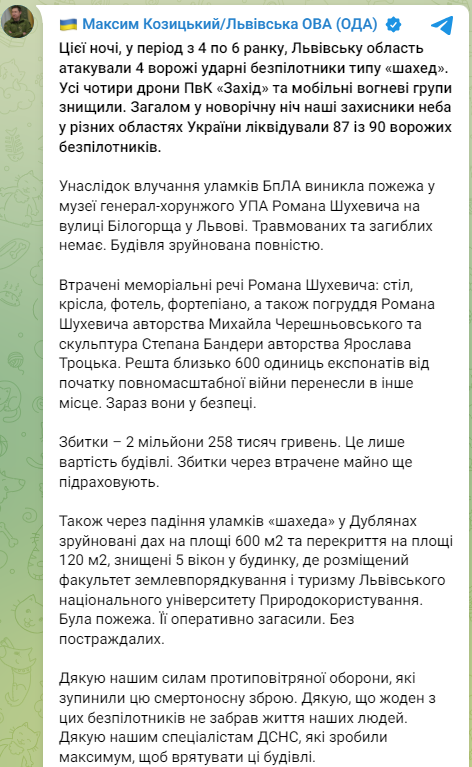 По его словам, из-за попадания обломков БпЛА произошел пожар в музее генерал-хорунжего УПА Романа Шухевича на улице Белогорща во Львове. Раненых и погибших нет, однако здание полностью разрушено.