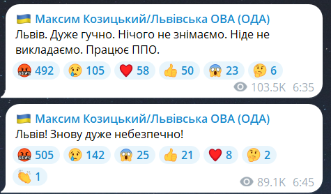 Оновлено 06:37. Очільник Львівської ОВА Максим Козицький повідомляє про сильні вибухи в області. За його словами, працює ППО.